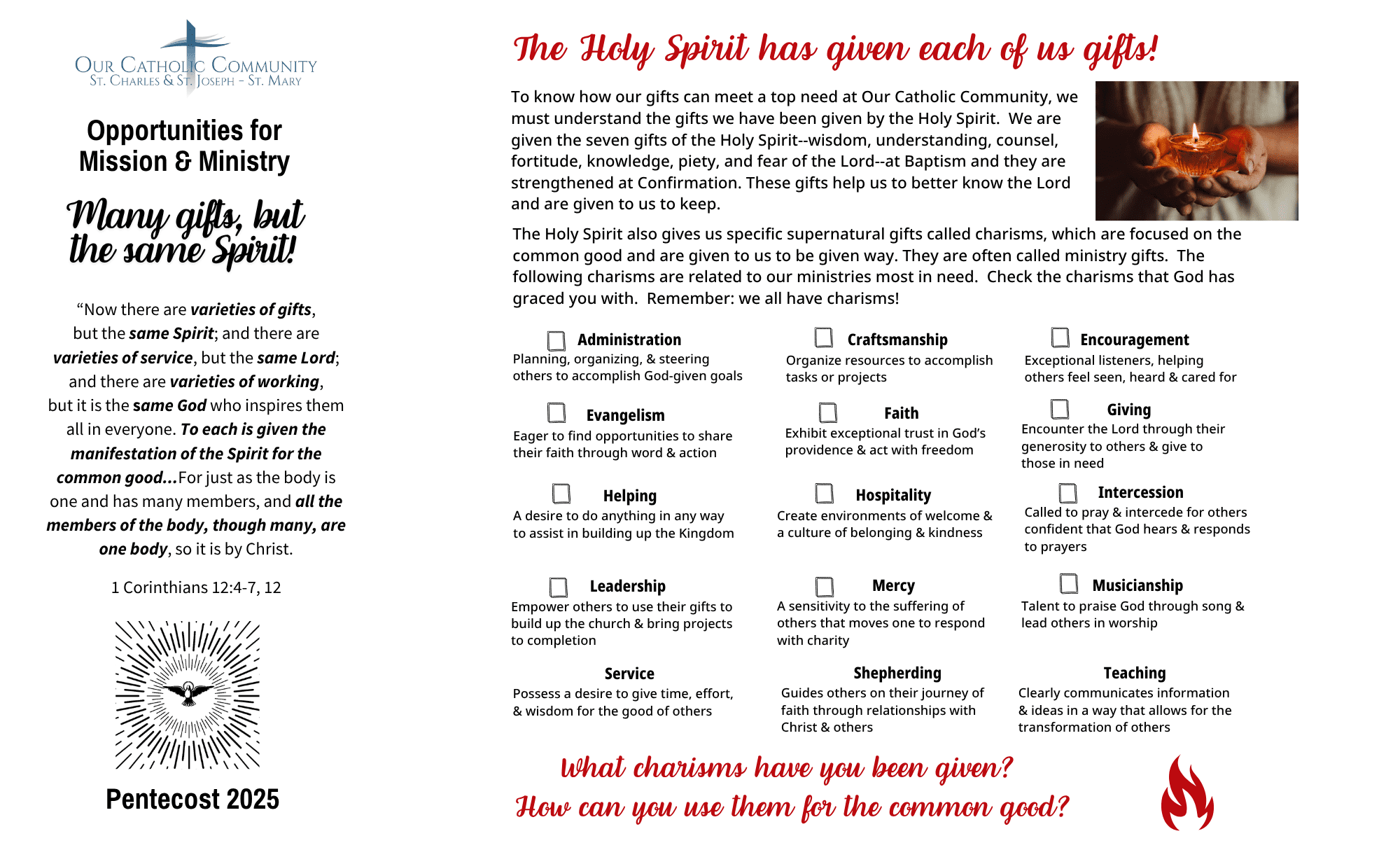 Welcome to our Catholic Community of St. Charles and St. Joseph-St. Mary! Whether new to the area, new to the church, or “coming home” to your Catholic Faith, we want you to feel welcome here as an important part of our Catholic Community.